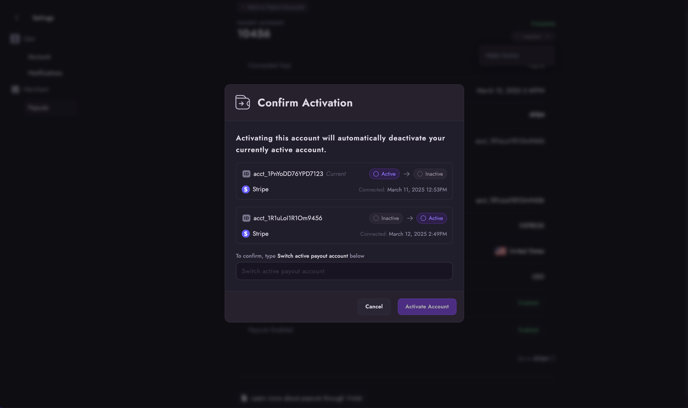 Once your new account has completed KYC, you can activate it to replace your current payout account: