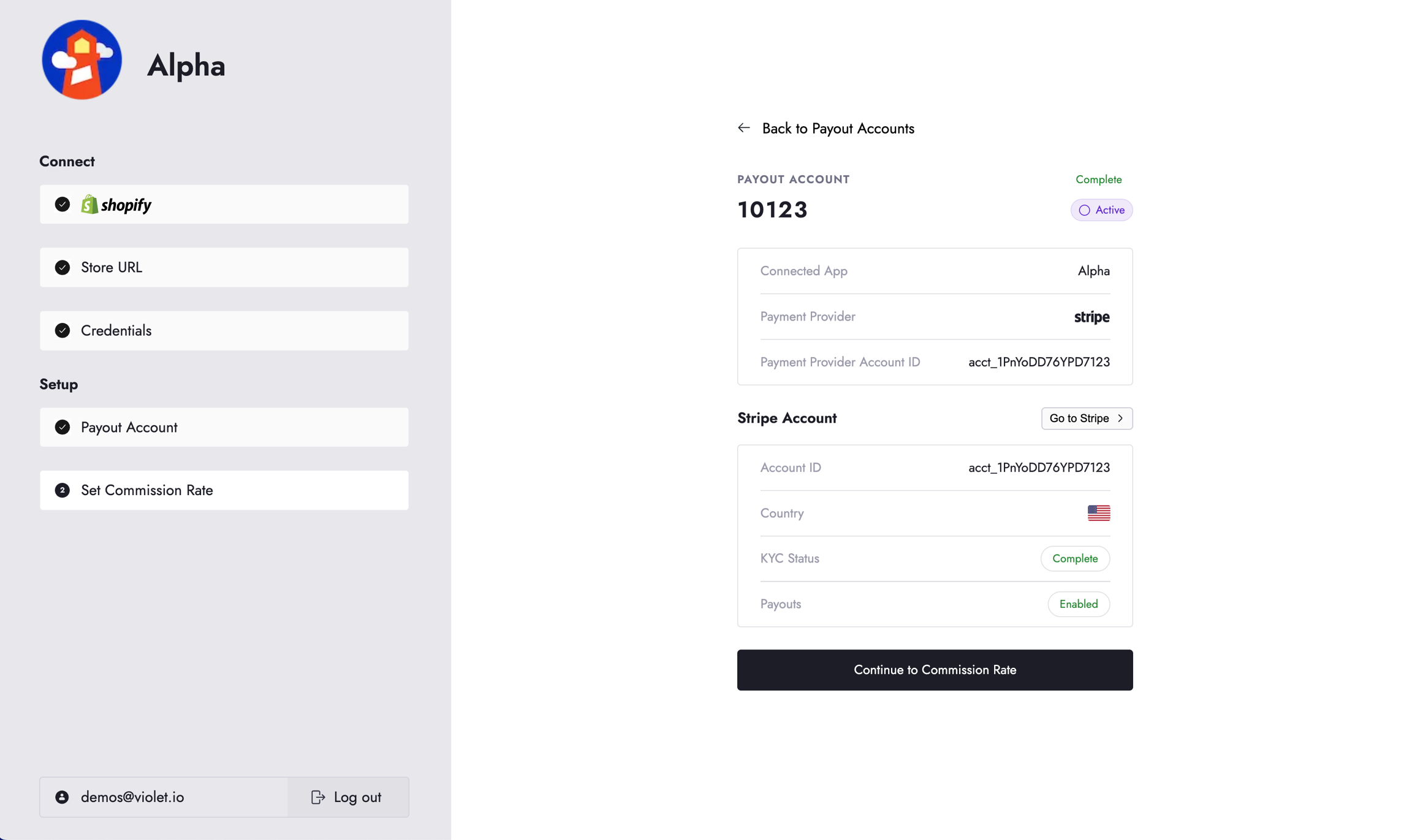 After returning from Stripe, your payout account status will be displayed in Violet Connect: