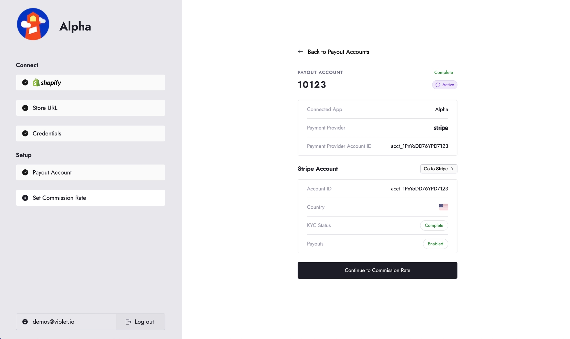 If you're a merchant, to receive payments for orders placed through Violet, you’ll need to connect a bank account via Stripe. Connected apps leverage Stripe Connect to make the onboarding process seamless. You can either create a Stripe Connect Express account specifically for handling transactions through your connected app's payment platform or link your existing Stripe Standard account via OAuth.