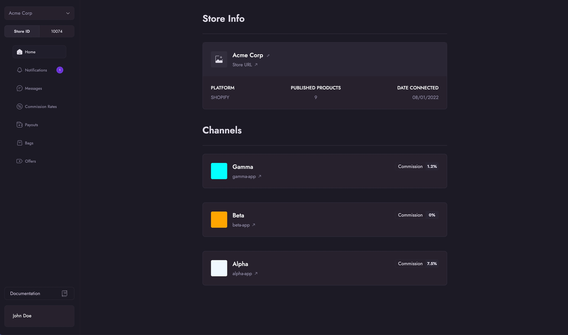 The Overview page is where they can see see information about their connected store, all the Channels they are connected to, and control their commission rates.