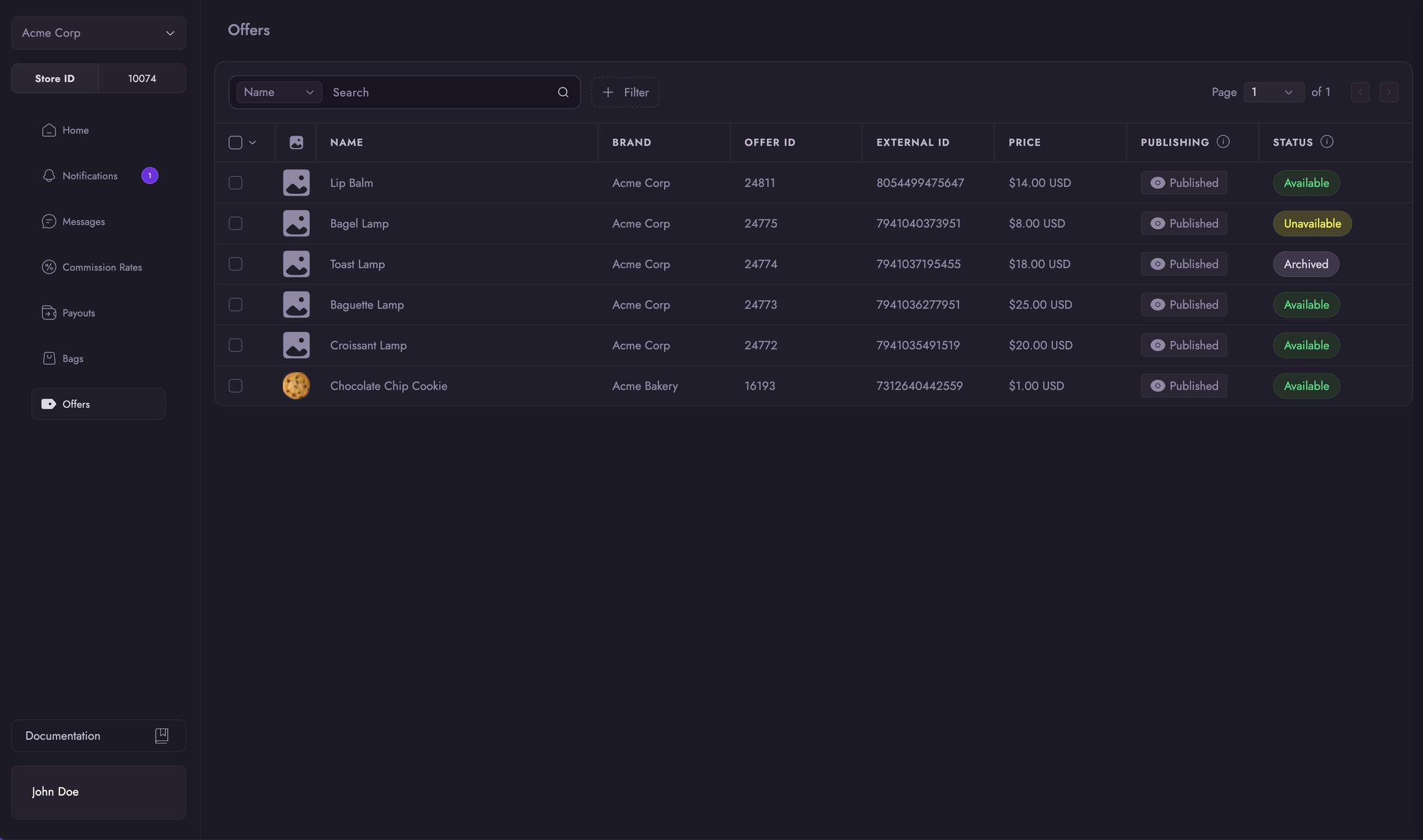 The Offers page is where they can see all the products that they have synced into Violet. Here they can Publish